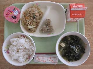 白ごはん シューマイ 春雨の中華炒め 中華スープ 黒ごまプリン 牛乳