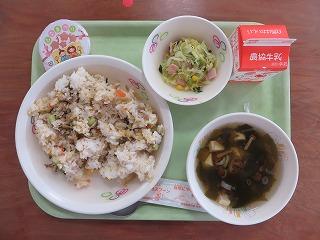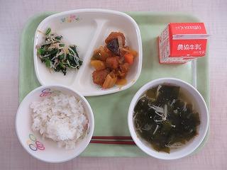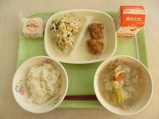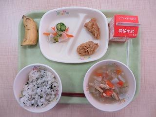 わかめごはん から揚げ 浅漬け 田舎汁 バナナ 牛乳