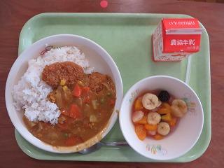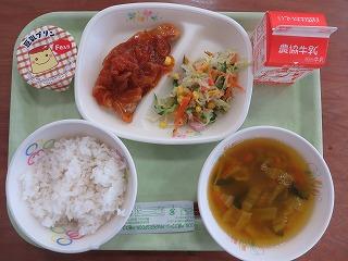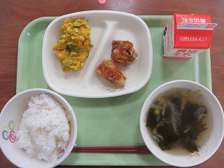 白ごはん ヤンニョムチキン カボチャサラダ 中華スープ 牛乳