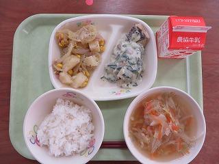 白ごはん 酢豚 もやしときゅうりの和え物 中華スープ 牛乳