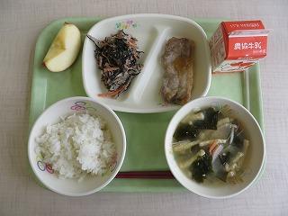 白ごはん 豚肉の生姜焼き きゅうりとゴボウのサラダ みそ汁 りんご 牛乳