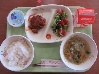 白ごはん ハンバーグトマトソース サラダ コンソメスープ ブルーベリーゼリー 牛乳