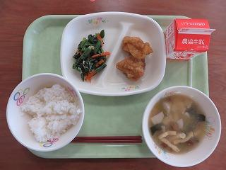 白ごはん 白ごはんチキン いそか和え 里芋のみそ汁 牛乳