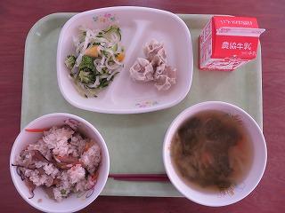 秋の香りご飯 シューマイ 柿サラダ じゃがいものみそ汁 牛乳