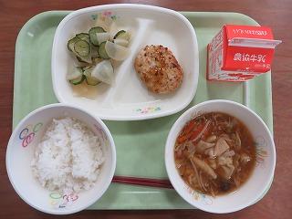 白ごはん 豆腐ハンバーグ 野菜のピリ辛 みそワンタンスープ 牛乳
