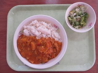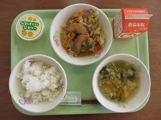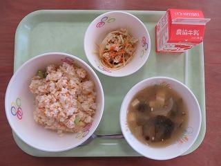 さつまいもご飯 鶏肉の照り焼き 馬肉和え みそ汁 野菜と果物のゼリー 牛乳