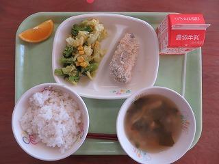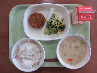 白ごはん メンチカツ グリーンサラダ クリームシチュー 牛乳