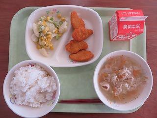 白ごはん チキンナゲット 枝豆コーンポテト ベイザンヌスープ 牛乳