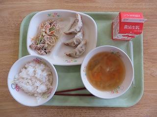 白ごはん ぎょうざ 焼きビーフン みそ汁 牛乳