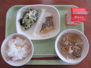 白ごはん ホキのマヨネーズ焼き わかめの酢の物 すいとん風煮 牛乳