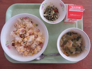 ベーコンピラフ 牛乳 チンゲンサイのスープ コールスローサラダ