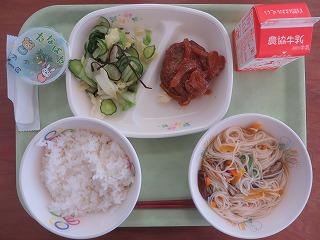 白ごはん 牛乳 ハンバーグトマトソース 野菜の昆布和え そうめん汁 天の川ゼリー