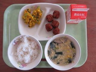 白ごはん 牛乳 ミートボールのケチャップ煮 大豆とカボチャのサラダ 華風かきたまスープ