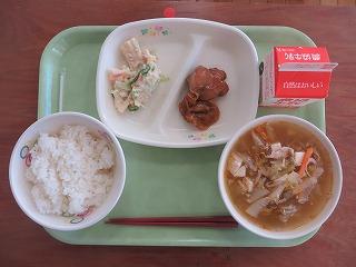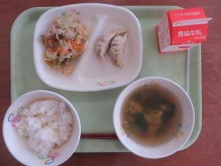 白ごはん 牛乳 ぎょうざ 野菜炒め チンゲン菜のスープ