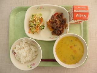 白ごはん 牛肉と野菜の炒めもの 野菜とチーズのサラダ じゃがいもとかぼちゃのミルクスープ 牛乳