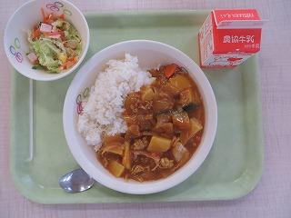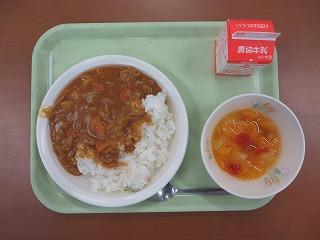 白ごはん フライドチキン スパゲティサラダ 野菜スープ 牛乳