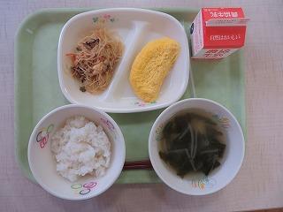 白ごはん オムレツ チャプチェ みそ汁 牛乳