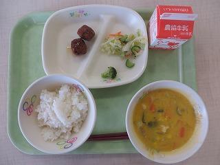 白ごはん ミートボールの甘酢あん サラダ パンプキンシチュー 牛乳