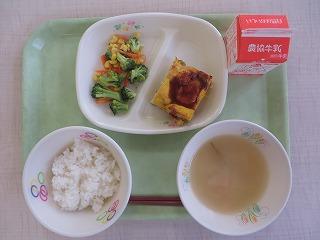 白ごはん 厚焼き玉子 ブロッコリーサラダ 大根のみそ汁 牛乳