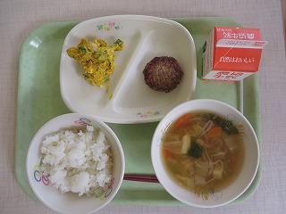 白ごはん いわしハンバーグ カボチャと大豆のサラダ 鶏だんご汁 牛乳