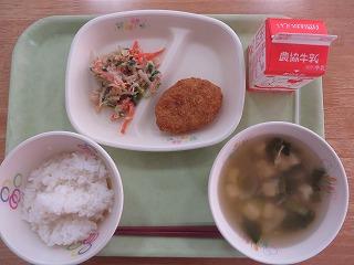 白ごはん イカメンチ バンバンジーサラダ チンゲン菜のスープ 牛乳