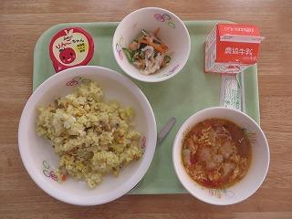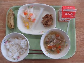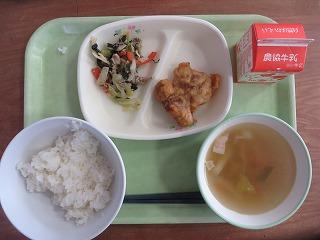 白ごはん 鶏肉のフリッター 彩り野菜炒め 冬野菜のスープ 牛乳