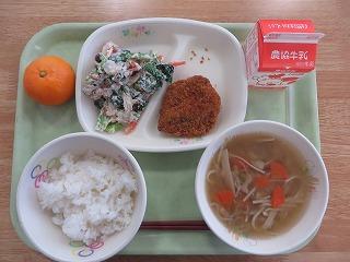 白ごはん ぶりのみそ漬けフライ しらあえ のっぺい汁 みかん 牛乳