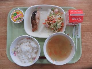 白ごはん 鮭のメープルソース コールスローサラダ チキンヌードルスープ カボチャプリン 牛乳