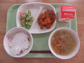 白ごはん ウインナーのトマト煮 白菜のラダ レンズマメのスープ 牛乳