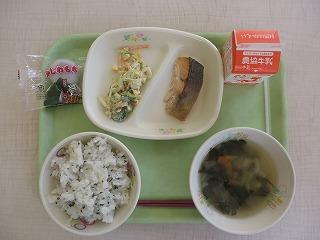 わかめごはん 鮭の塩焼き ごまマヨネーズ みそ汁 かしわもち 牛乳