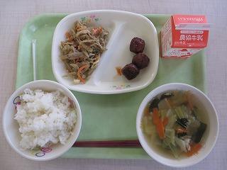 白ごはん ミートボールのケチャップ煮 きんぴらごぼう コンソメスープ 牛乳