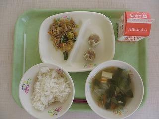 白ごはん シューマイ ホイコーロー 豆腐とチンゲン菜のスープ