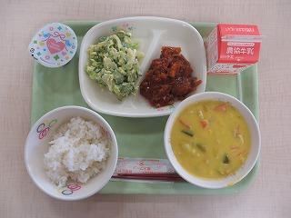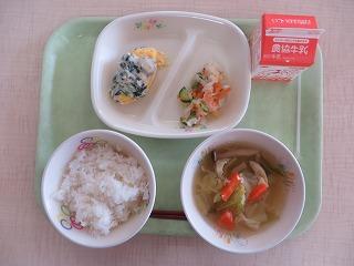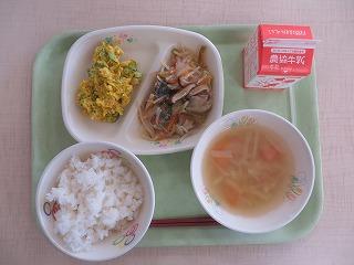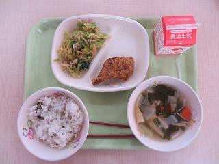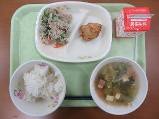 白ごはん 鶏肉の竜田揚げ ごぼうサラダ 豆腐とチンゲン菜のスープ 牛乳