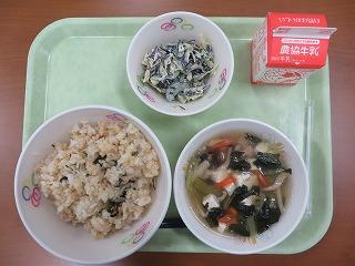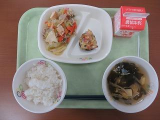 わかめごはん サバのカレー揚げ ごまあえ 厚揚げのみそ汁 牛乳