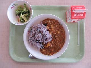 2023年2月17日 13時01分黒豆ごはん キーマカレー サラダ 牛乳
