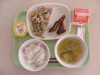 白ごはん ハタハタのから揚げ 卯の花 キャベツのみそ汁 プリン 牛乳