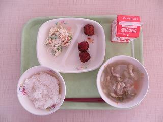 白ごはん ミートボールのケチャップ煮 イカくんサラダ 豚汁 牛乳