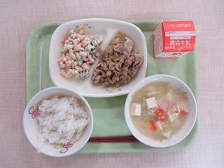 白ごはん 豚肉の生姜焼き 大浜大豆のサラダ 宗玄の酒かす汁 牛乳