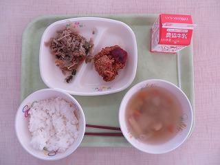 白ごはん チキンカツ こんにゃくサラダ 里芋のみそ汁 牛乳
