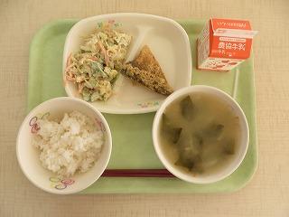 白ごはん さばのカレー揚げ マカロニサラダ みそ汁 牛乳