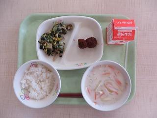 白ごはん ミートボールのケチャップ煮 ほうれん草ときのこのソテー ミルクスープ 牛乳