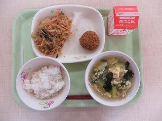 白ごはん かぼちゃのチーズフライ チャプチェ みそ汁 牛乳