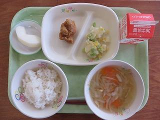 白ごはん 鶏肉のピリ辛 枝豆コーンポテト コンソメスープ 梨 牛乳