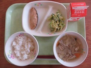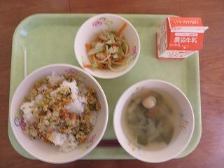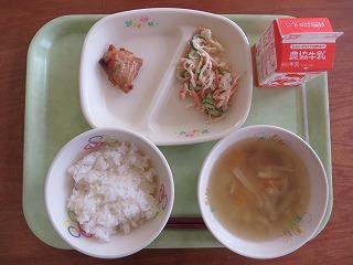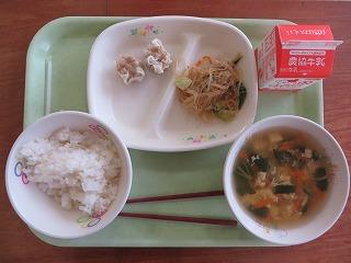 白ごはん シューマイ 春雨の中華炒め 小松菜のスープ 牛乳