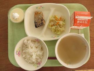 白ごはん さばのごまみそ焼き きゃべつの甘酢あえ みそ汁 手作りババロア 牛乳