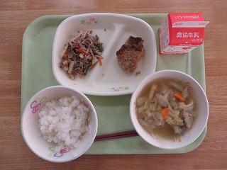 白ごはん かぼちゃひき肉フライ もやしのナムル 含め煮 牛乳