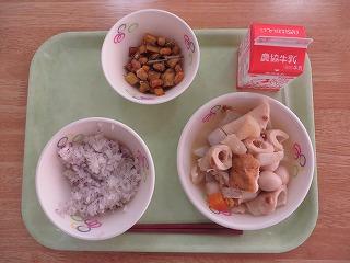 ゆかりごはん 大豆とさつまいものごまがらめ おでん 牛乳