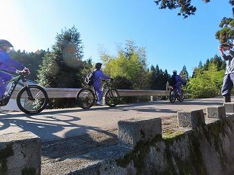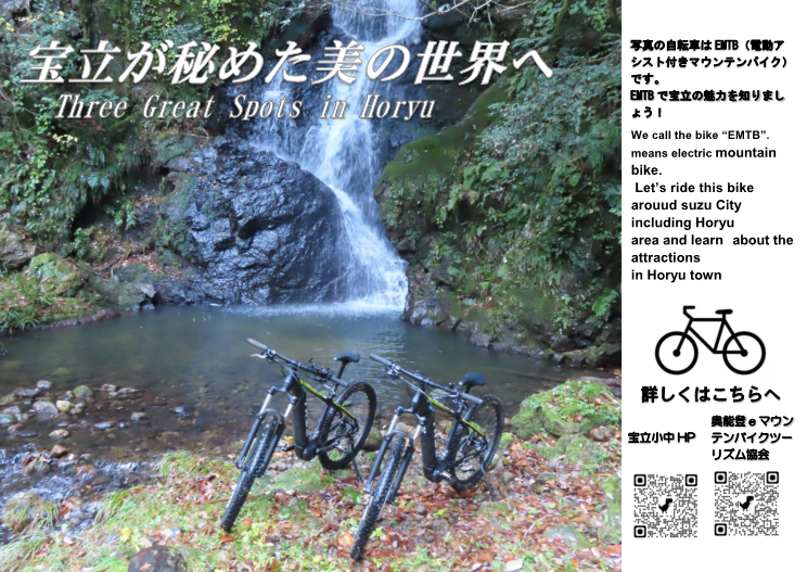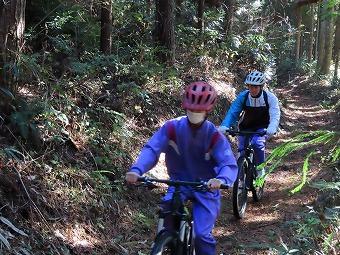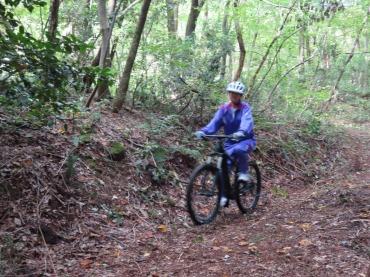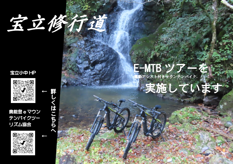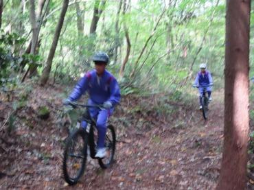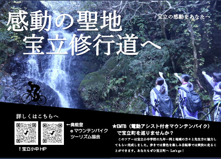 10月16日(日)  9年生が整備した道をEマウンテンバイクで試走をしてみました。場所によっては、うまく走られず押して登るところもありましたが、とくに時間をかけて除草作業や落ち葉などを熊手で撤去したところは、気持ちよく走り抜けることができました。コースは上級者向けといったところですが、宝立町に新たな魅力を創り出すことができました!今後は看板の仕上げや橋を架ける作業などを行い、仕上げに向かます!