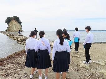 6月1日(木)9年生が総合的な学習の時間で行っている『ふるさと活性化プロジェクト』のひとつ『宝立三大スポットめぐり』のパンプレットが置いてある見附島に調査に行きました。