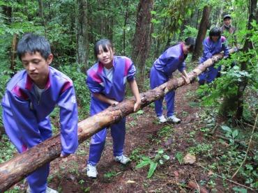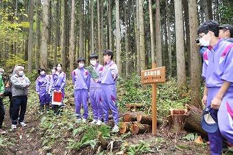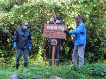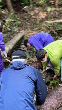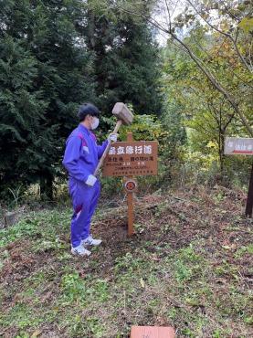 10月29日(土)に看板を設置しました。空海伝説活用実委 員会とプライム128Jr の方にも協力していただき、7 カ所に看板を設置しました。また、現在2本の丸太で掛かってる丸太橋を3本にするために、周辺の整備と溝堀を行いました。切り残してある丸太の撤去では、想像以上の丸太の重さに生徒たちは驚いていました。